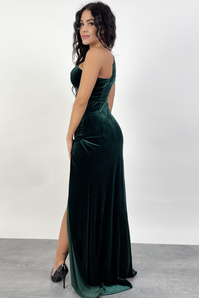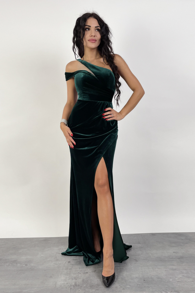 - Długa wieczorowa welurowa sukienka na jedną ramię z rozcięciem PORTO